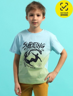 Футболка для мальчика свободного покроя. Рукав втачной, горловина обработана притачной бейкой из рибаны с лайкрой. Перед декорирован принтом "Панно".