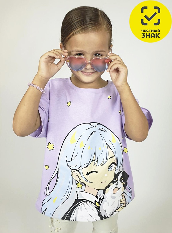 Футболка (оверсайз) для девочки, прямой силуэт, спущенное плечо, короткий рукав, перед с печатью. Горловина обработана притачной планкой. Низ изделия и рукава подшиты.