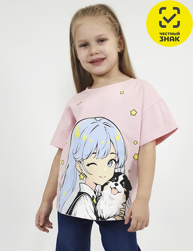 Футболка (оверсайз) для девочки, прямой силуэт, спущенное плечо, короткий рукав, перед с печатью. Горловина обработана притачной планкой. Низ изделия и рукава подшиты.