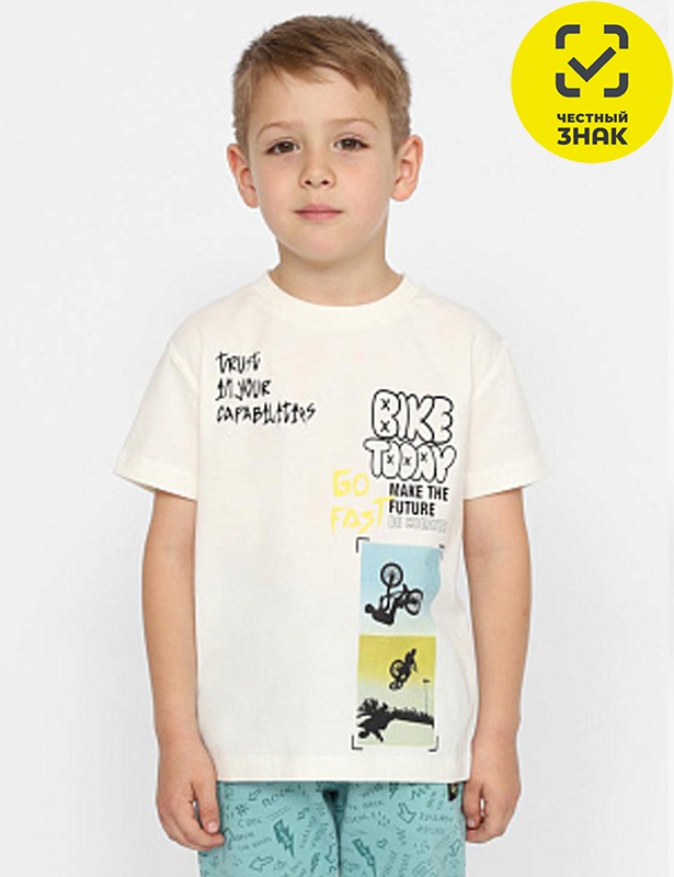Футболка для мальчика с короткими рукавами и принтом спереди. Горловина круглая, обработана притачным воротником из полотна с эластаном.