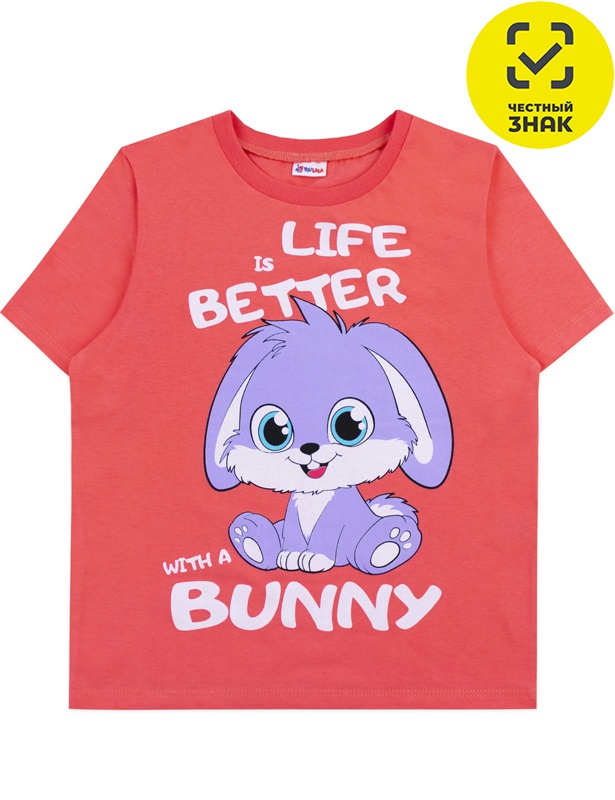 Футболка из гладкокрашеного полотна, короткие втачные рукава, округлый вырез горловины, окантованный бейкой в цвет основного полотна, на полочке печать.