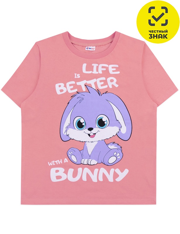 Футболка из гладкокрашеного полотна, короткие втачные рукава, округлый вырез горловины, окантованный бейкой в цвет основного полотна, на полочке печать.