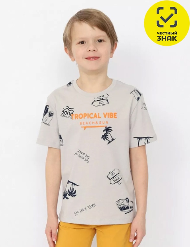 Футболка для мальчика с коротким рукавом из набивного полотна. Горловина обработана притачной бейкой из рибаны с лайкрой. Перед декорирован принтом.