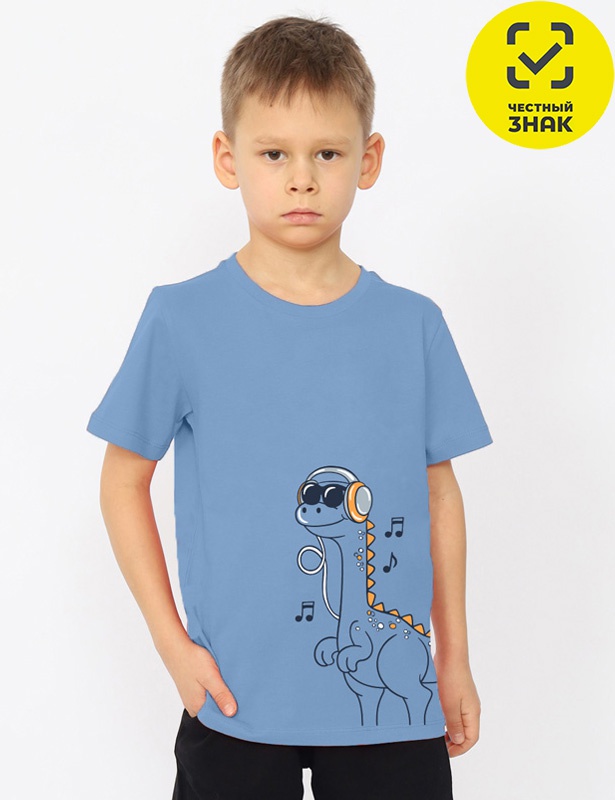 Футболка для мальчика из кулирного полотна, с короткими втачными рукавами, округлая горловина, перед декорирован принтом.
