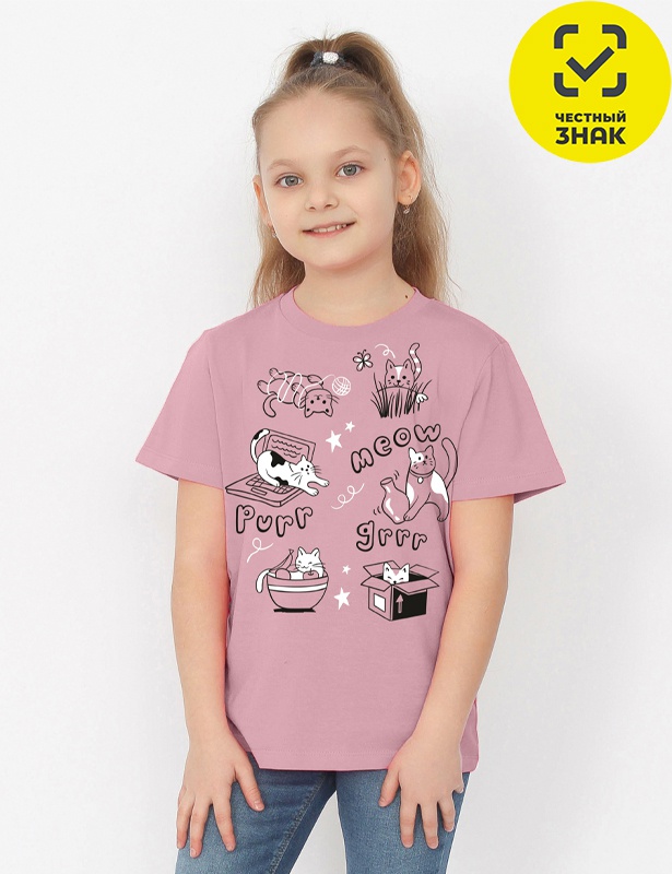 Футболка для девочки из кулирного полотна, с короткими втачными рукавами, округлая горловина, перед декорирован принтом.