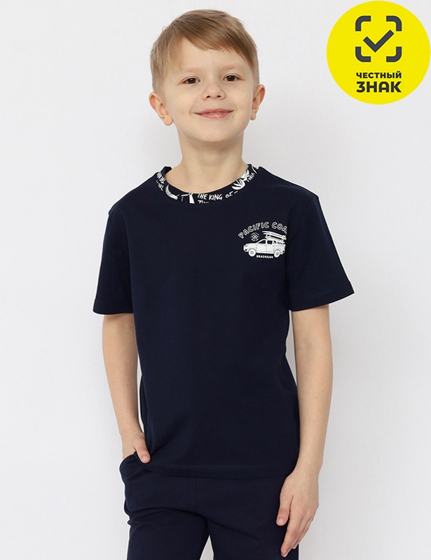 Футболка для мальчика свободного покроя. Рукав втачной, горловина обработана притачной бейкой из рибаны с лайкрой. Перед и воротник декорированы принтом.