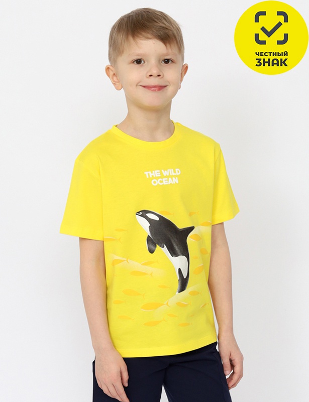 Футболка для мальчика свободного покроя. Рукав втачной, горловина обработана притачной бейкой из рибаны с лайкрой. Перед декорирован принтом.