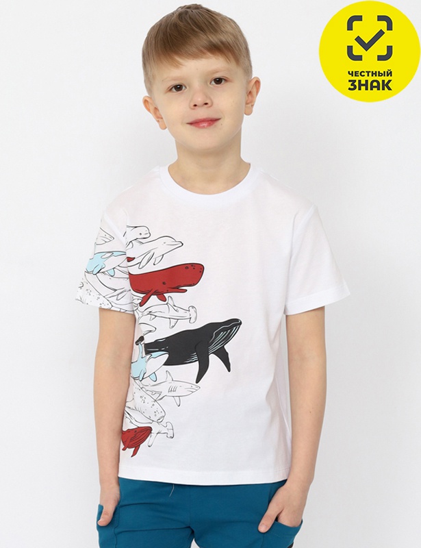 Футболка для мальчика свободного покроя. Рукав втачной, горловина обработана притачной бейкой из рибаны с лайкрой. Перед и рукав декорированы принтом "Панно".