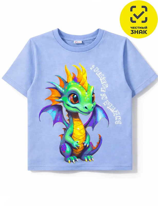 Футболка из гладкокрашеного полотна с принтом на полочке, короткие втачные рукава, округлый вырез горловины, окантованный бейкой из основного полотна