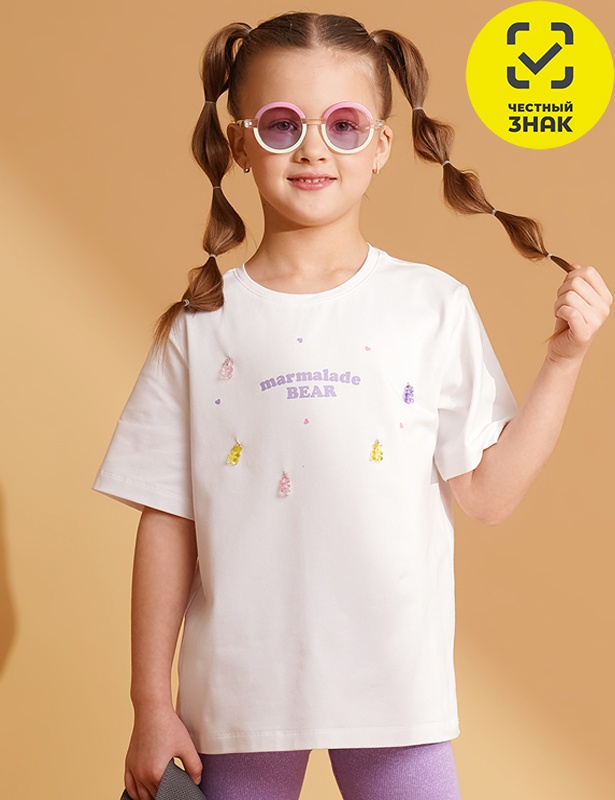 Базовая футболка из хлопка. Круглый вырез горловины оформлен эластичной окантовкой. Трендовый декор и принт делает образ необычным, ярким и стильным!