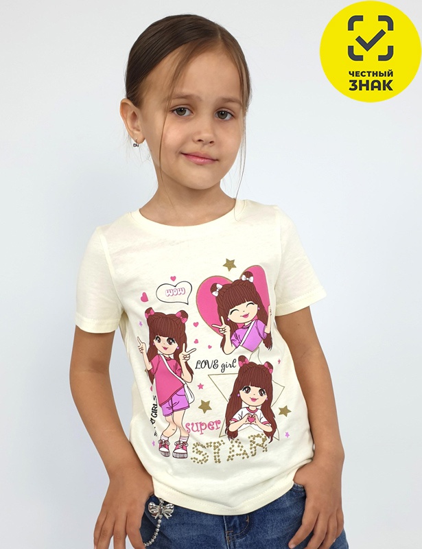 Футболка для девочки - прямого силуэта, печать на переде, короткий втачной рукав. Низ рукава и фуфайки подшит. Горловина обработана ластиком.