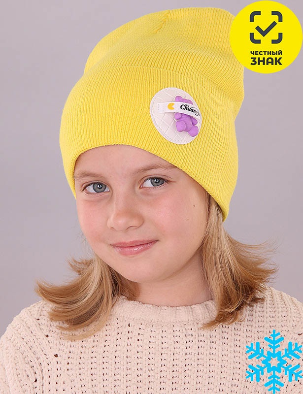 Шапка детская с добавлением шерсти, на подкладе из флиса, с широким отворотом, декорирована нашивкой.