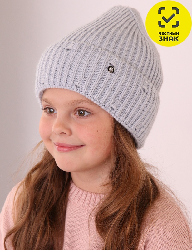 Шапка для девочки, выполнена из пряжи с добавлением вискозы, на подкладе из флиса. Шапка с широким отворотом, декорирована нашивкой.