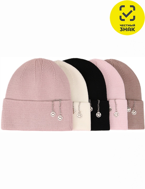 Шапка детская на сезон осень-весна, вязаная, однослойная, с отворотом, с декоративной нашивкой и цепочкой.