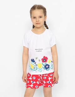 Комплект для девочки - футболка и шорты. Футболка с рукавами-реглан, с резинкой по низу рукавов и горловине. Спереди декоративный принт-панно с блестящим эффектом. Шорты для девочки из набивного хлопка, по талии на резинке, с декоративной нашивной этикеткой.