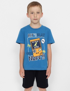 Комплект для мальчика. Футболка с короткими рукавами и принтом спереди "давай играть". По низу рукава и изделия проложена контрастная декоративная строчка. Шорты с боковыми карманами. Пояс притачной, с резинкой внутри.