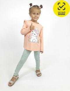 Комплект для девочки. Джемпер силуэта трапеция, длинный втачной рукав, в пройме рюша. Горловина окантована, застежка на пуговицу по спинке. Вышивка и печать на переде. Лосины длинные с печатью на правой стороне внизу, вверху на резинке.