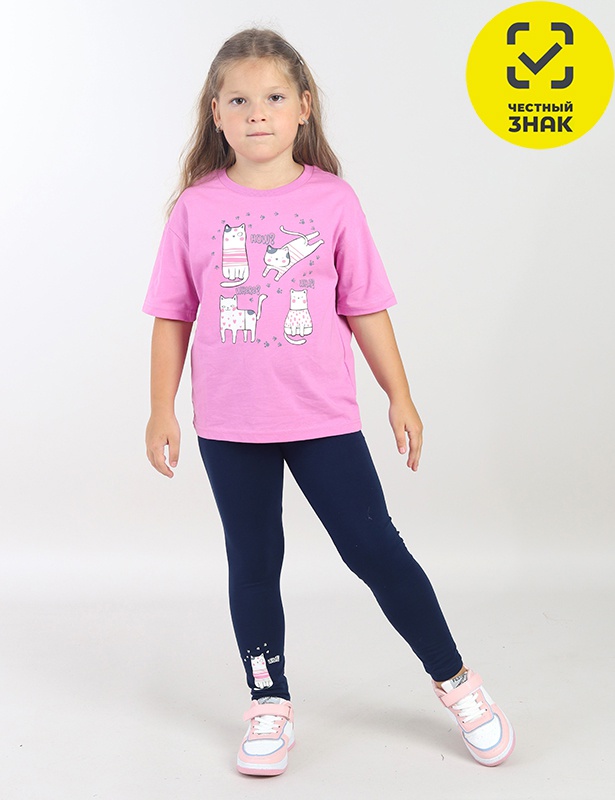 Комплект для девочки (футболка, легинсы) из мягкого трикотажа. Футболка свободного силуэта, выполнена из кулирки в полоску, горловина круглая, оформлена кашкорсе. На полочке выполнена шелкография - четыре забавных котика. Легинсы выполнены из эластичного трикотажа с шелкографией в виде котика.