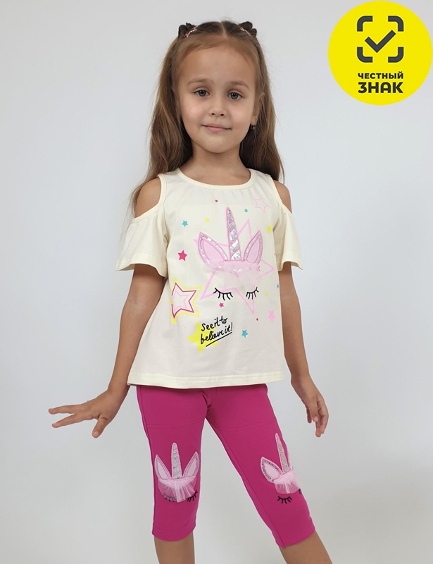 Модный комплект для девочки включает футболку силуэта трапеция с стильным сочетанием печати и вышивки на передней части. Модель дополнена втачным рукавом с декоративным вырезом на плече, все края аккуратно окантованы. В комплект входят укороченные лосины с изящной вышивкой-аппликацией и стильным отделочным элементом из сетки. Комплект идеально подойдет как для повседневной носки, так и для особых случаев, сочетая в себе комфорт и модный дизайн.