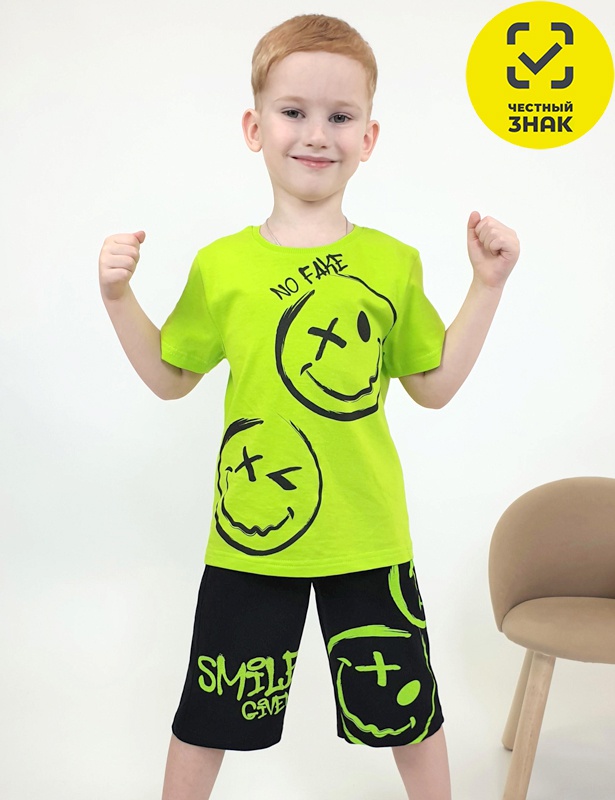 Футболка прямая с коротким втачным рукавом и принтом на передней части. Горловина с резинкой. Шорты удлиненные с притачным поясом на резинке. Принт расположен: на правой передней половинке в нижней части и с левой стороны сзади.