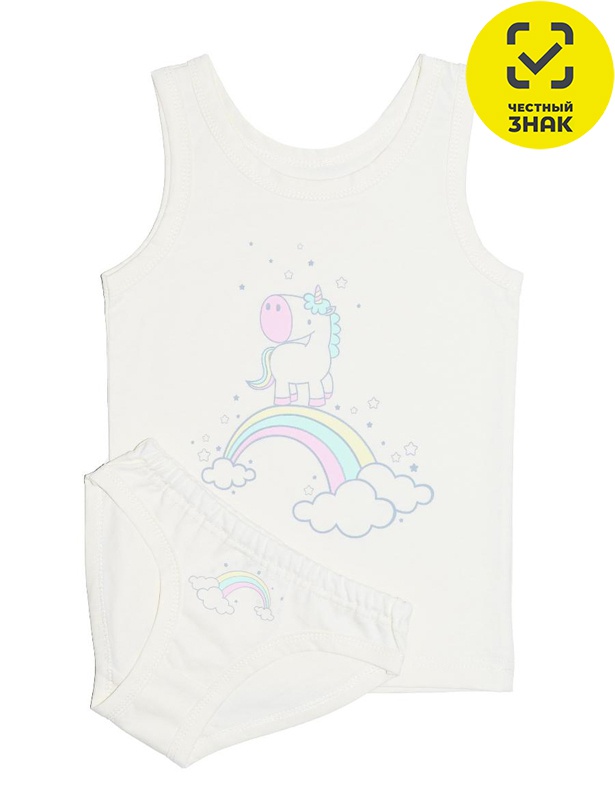 Комплект для девочки: майка с принтом на передней части, с окантованной горловиной и проймами. Трусики на мягкой резинке, с окантованными ножками и декоративным принтом.
