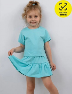Комплект для девочки из хлопкового гладкокрашеного кулирного полотна состоит из 2-х предметов. Футболка с короткими цельнокроенными рукавами с окантовкой, округлой горловиной, свободного силуэта. Юбка на кокетке, с широким воланом, по талии на резинке.