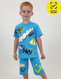 Комплект для мальчика состоит из 2-х предметов. Футболка прямая, короткий втачной рукав. Перед и правый рукав с печатью. Горловина обработана ластиком. Шорты удлиненные с притачным поясом и резинкой, печать на передних половинках внизу.