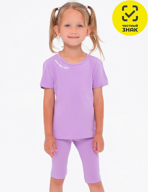 Костюм для девочки состоит из футболки и велосипедок из гладкокрашенного полотна. Футболка свободного силуэта с округлой горловиной и короткими рукавами. Декор — надпись «Good vibes only» спереди. Велосипедки оснащены эластичным поясом.