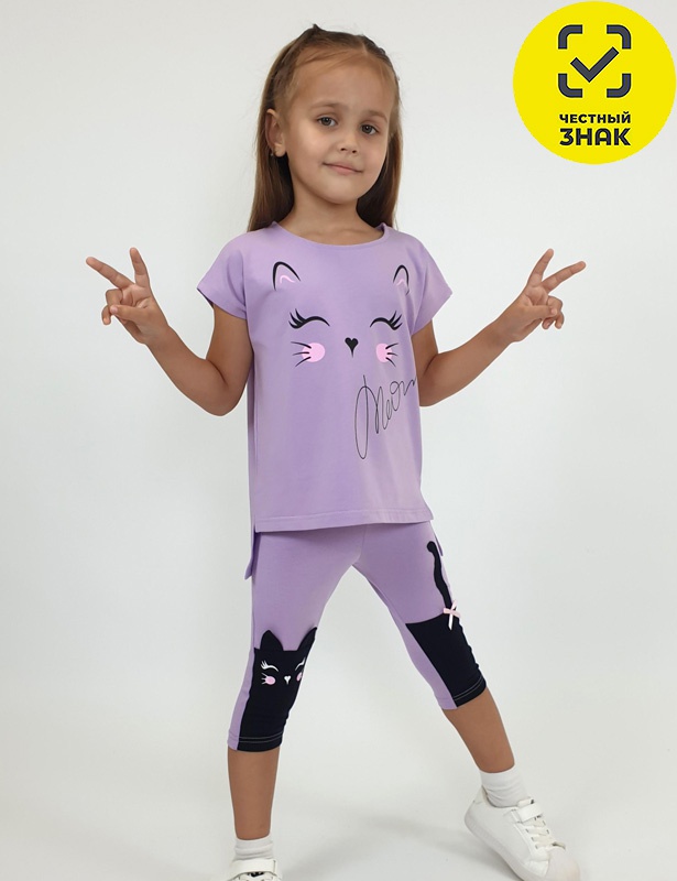 Комплект для девочки. Футболка прямого силуэта, удлиненная спинка с разрезами, перед с печатью. Спущенное плечо, горловина окантована и подшита. Лосины укороченные, передние половинки с подрезами. Вышивка-аппликация слева, печать на правой передней стороне. Отделочный бантик.