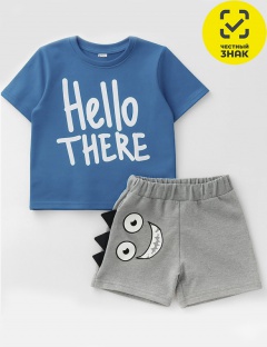 Комплект состоит из 2-х предметов. Футболка с короткими втачными рукавами, округлой горловиной, на полочке печать. Шорты короткие на поясе на резинке, спереди печать.