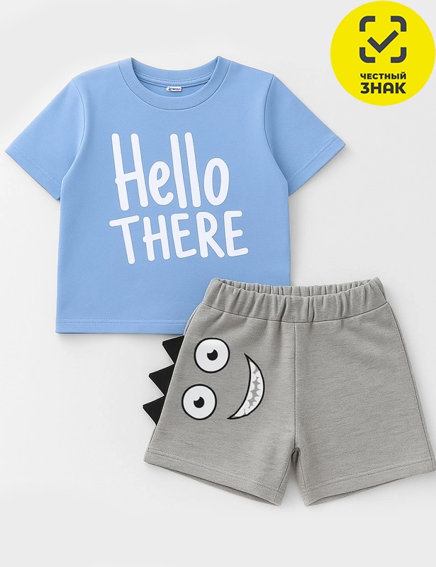 Комплект состоит из 2-х предметов. Футболка с короткими втачными рукавами, округлой горловиной, на полочке печать. Шорты короткие на поясе на резинке, спереди печать.