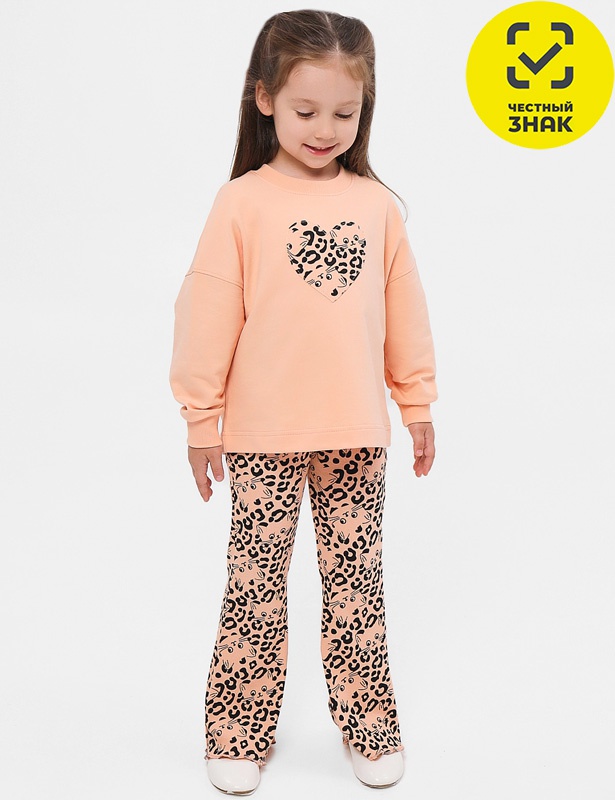 Комплект для девочки включает в себя: джемпер из футера 2х нитка петля и штаны из ткани кашкорсе. Джемпер прямого кроя с длинными втачными рукавами на манжетах, округлая горловина. На джемпере имеется нашивка в виде сердца. Штаны на поясе на резинке, расклешенные к низу.