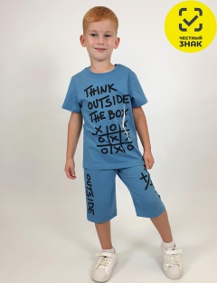 Комплект для мальчика из кулирного полотна. Футболка - прямого кроя, короткий втачной рукав, перед с печатью. Горловина обработана ластиком. Шорты - удлиненные с притачным поясом, с резинкой, без бокового шва. Печать сбоку на обеих штанинах.