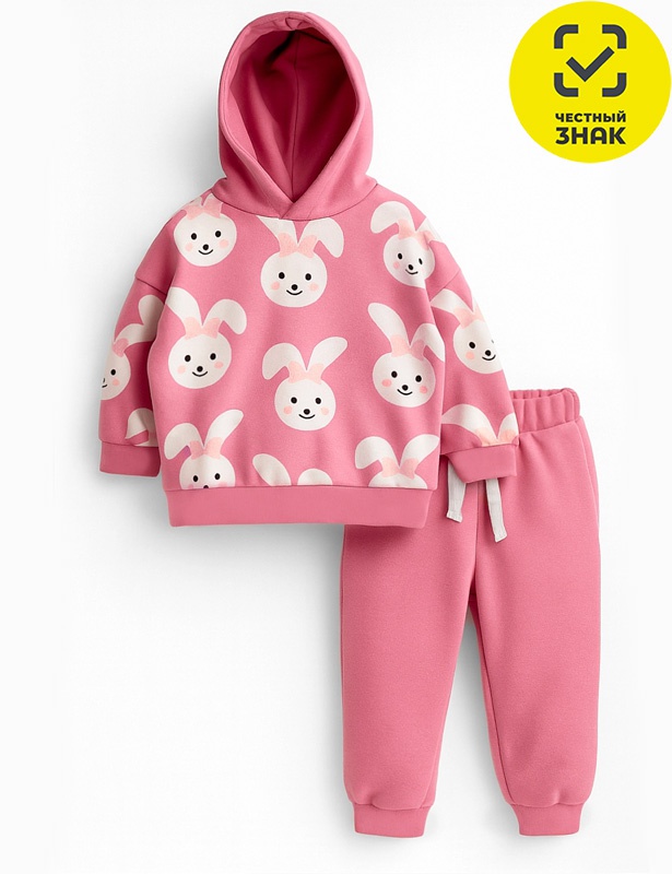 Костюм для девочки из футера двухнитки с начесом, состоит из 2-х предметов. Джемпер декорирован принтом, с капюшоном, длинные рукава со спущенной линией плеча, с манжетами, притачной пояс по низу изделия. Брюки прямые, на поясе с кулиской и со шнуром, по нижним срезам на манжетах.