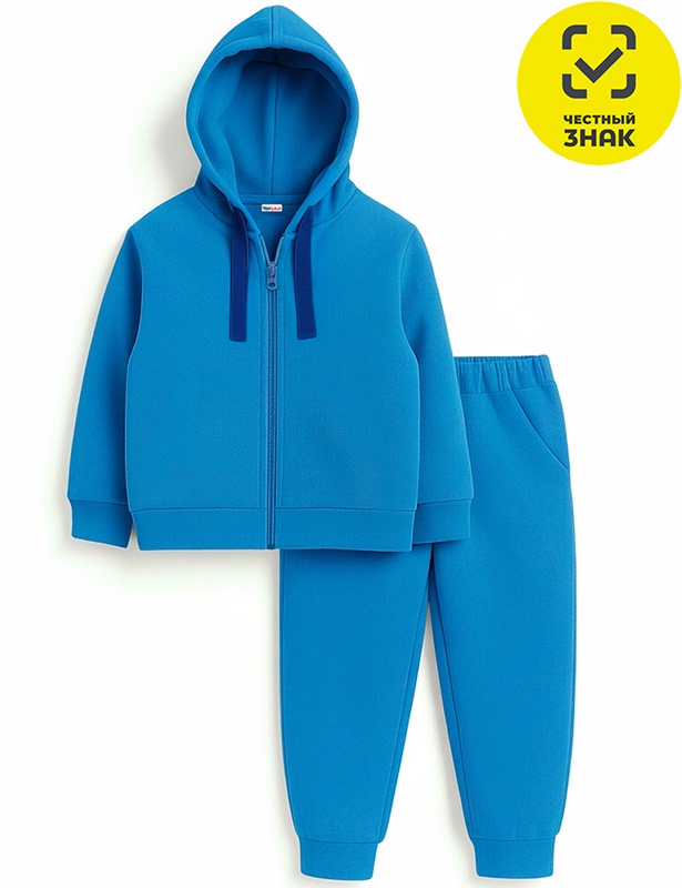 Комплект из футера двухнитки с начесом состоит из 2-х предметов. Куртка на молнии, с капюшоном на кулиске со шнуром, длинные втачные рукава с манжетами. Брюки прямые с манжетами по низу, на поясе на резинке, по бокам карманы.