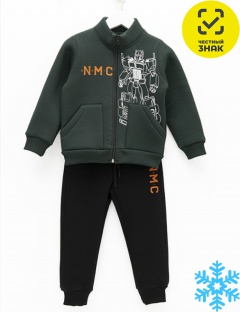 Костюм двойка из футера трехнитки с начесом для мальчика состоит из куртки и брюк. Куртка на молнии, длинные рукава с манжетами, воротник стойка, 2 накладных кармана, печать на полочке. Брюки прямые внизу на манжетах, на эластичном поясе.