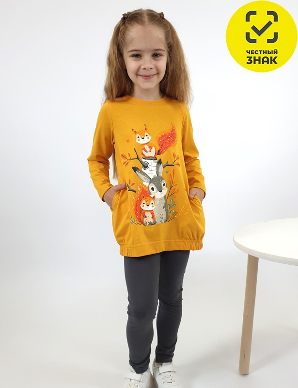 Комплект для девочки (джемпер+лосины). Джемпер свободного кроя, с печатью по переду, с двумя карманами в боковых швах. Рукав втачной, длинный. Низ изделия подшит с резинкой по боковым швам. Горловина обработана ластиком. Лосины длинные на резинке, без боковых швов.