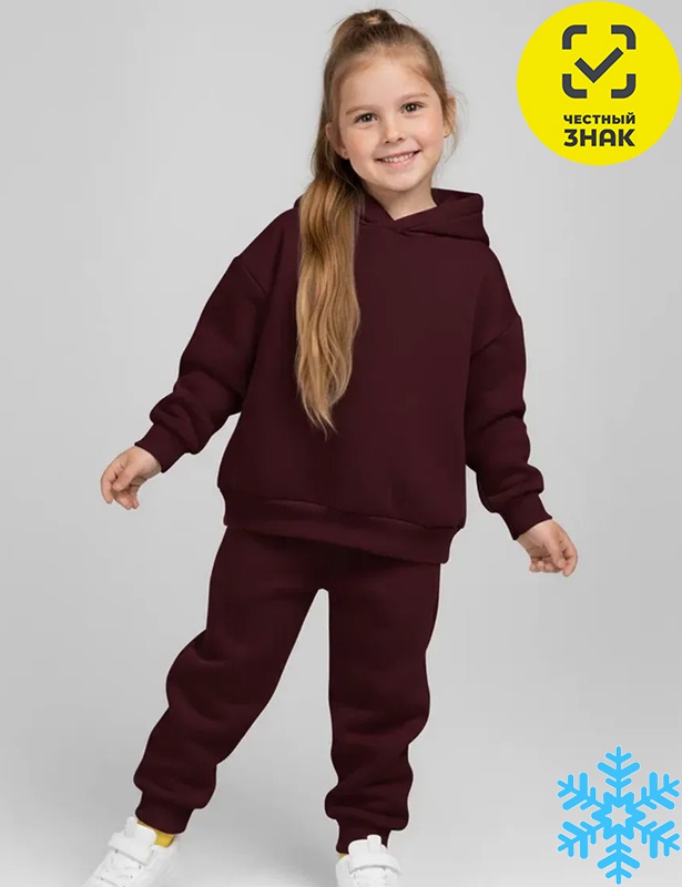 Костюм детский из футера трехнитки с начесом, состоит из 2-х предметов. Толстовка с длинными втачными рукавами на манжетах, со спущенной линией плеча, с капюшоном. Брюки на поясе на резинке, снизу на притачных манжетах.