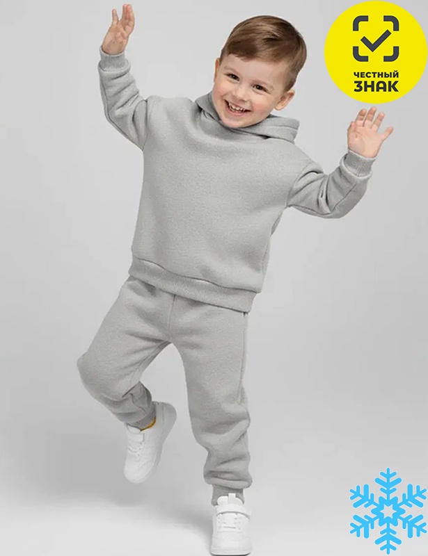 Костюм детский из футера трехнитки с начесом, состоит из 2-х предметов. Толстовка с длинными втачными рукавами на манжетах, со спущенной линией плеча, с капюшоном. Брюки на поясе на резинке, снизу на притачных манжетах.