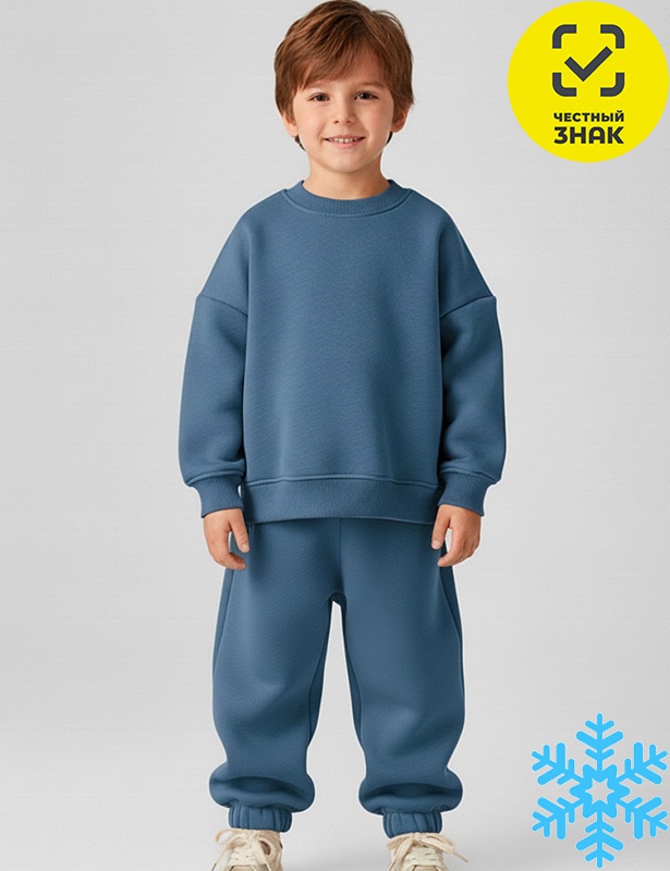Костюм детский из футера трехнитки с начесом, состоит из 2-х предметов. Толстовка с длинными втачными рукавами на манжетах, со спущенной линией плеча. Брюки на поясе на резинке.