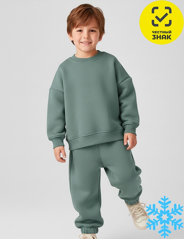 Костюм детский из футера трехнитки с начесом, состоит из 2-х предметов. Толстовка с длинными втачными рукавами на манжетах, со спущенной линией плеча. Брюки на поясе на резинке.