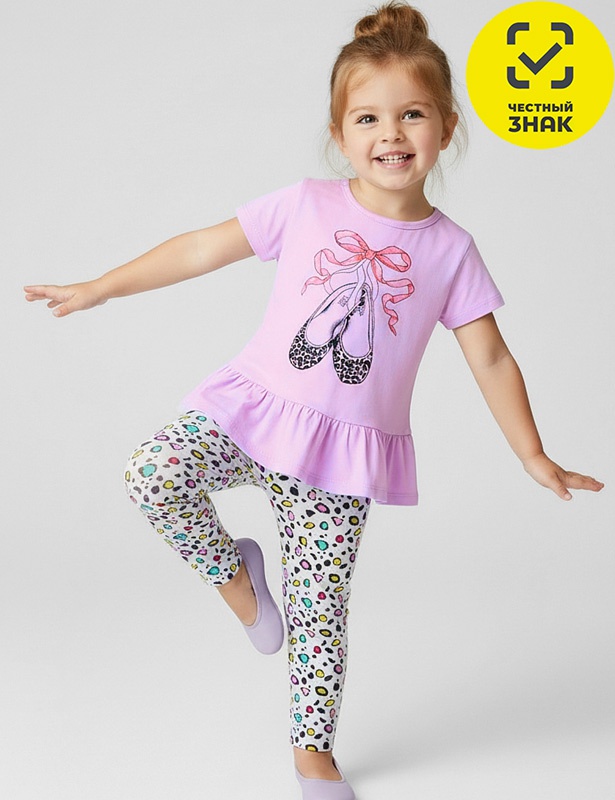 Комплект для девочки состоит из 2-х предметов. Футболка из гладкокрашеного полотна, прямого кроя, по низу декорирована баской, с короткими втачными рукавами, округлая горловина, застежка на кнопки по плечу. Лосины из набивного полотна, облегающие, по талии на резинке.