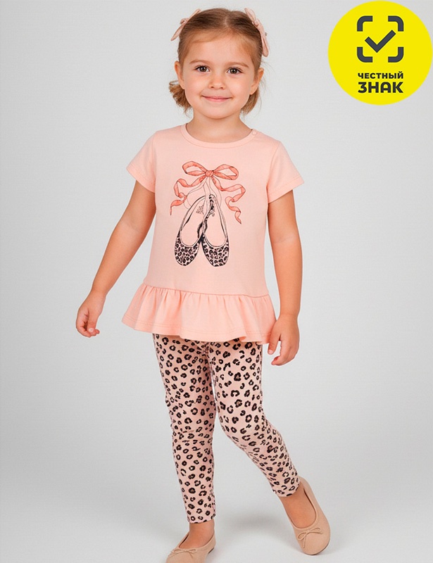 Комплект для девочки состоит из 2-х предметов. Футболка из гладкокрашеного полотна, прямого кроя, по низу декорирована баской, с короткими втачными рукавами, округлая горловина, застежка на кнопки по плечу. Лосины из набивного полотна, облегающие, по талии на резинке.