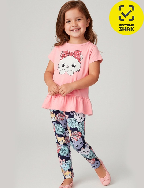 Комплект для девочки состоит из 2-х предметов. Футболка из гладкокрашеного полотна, прямого кроя, по низу декорирована баской, с короткими втачными рукавами, округлая горловина, застежка на кнопки по плечу. Лосины из набивного полотна, облегающие, по талии на резинке.