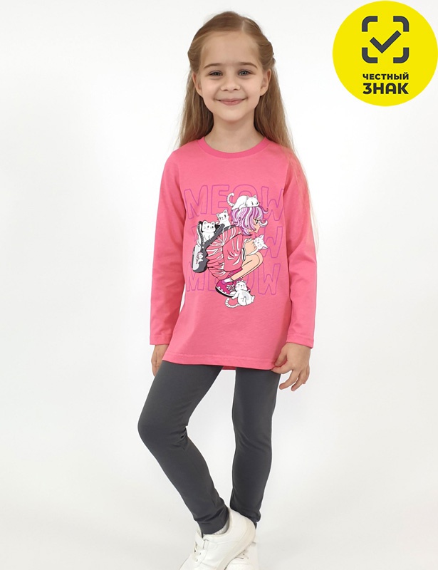 Комплект для девочки (джемпер+ лосины). Джемпер-силуэт трапеция, перед с печатью. Рукав втачной длинный. Горловина обработана ластиком, низ изделия и рукава подшиты. Лосины длинные, вверху на резинке.