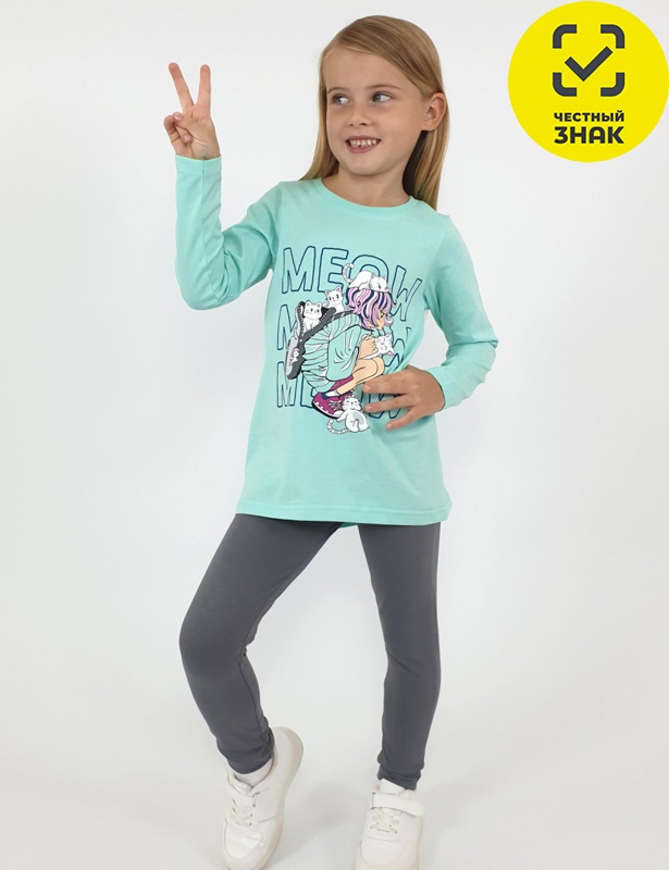 Комплект для девочки (джемпер+ лосины). Джемпер-силуэт трапеция, перед с печатью. Рукав втачной длинный. Горловина обработана ластиком, низ изделия и рукава подшиты. Лосины длинные, вверху на резинке.