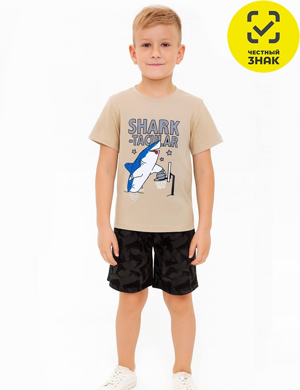Комплект для мальчика: футболка и шорты из мягкого трикотажа. Футболка гладкокрашенная с кортким рукавом. Горловина круглая, из рибаны с лайкрой. На полочке выполнена шелкография. Шорты с поясом на резинке. Полотно с набивкой "абстракция".