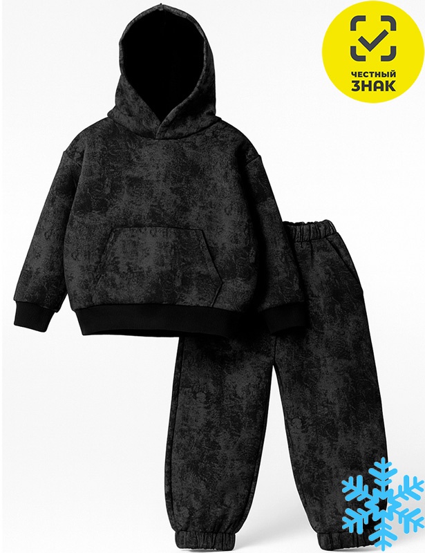 Костюм детский из футера трехнитки с начесом, состоит из 2-х предметов. Толстовка с длинными втачными рукавами на манжетах, со спущенной линией плеча, с капюшоном. Брюки на поясе на резинке