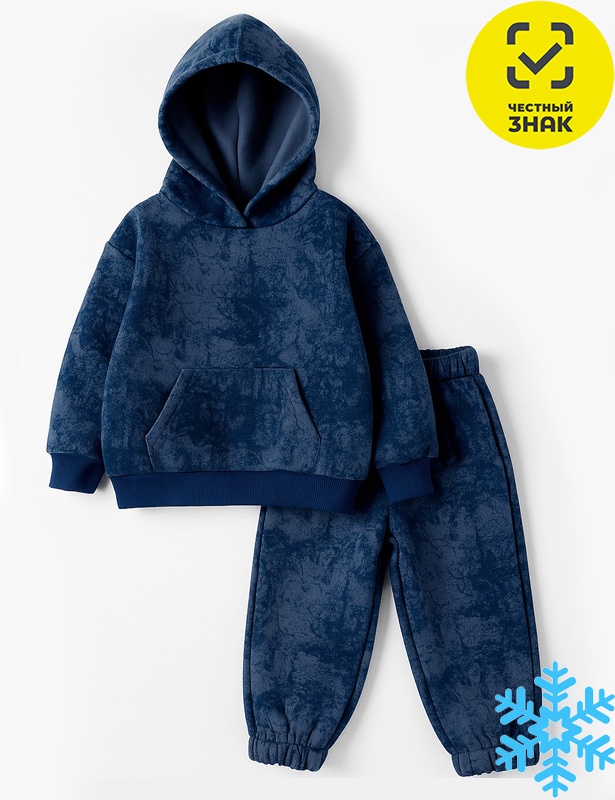 Костюм детский из футера трехнитки с начесом, состоит из 2-х предметов. Толстовка с длинными втачными рукавами на манжетах, со спущенной линией плеча, с капюшоном. На полочке карман, линия среза выполнена без обработки.Брюки на поясе на резинке.