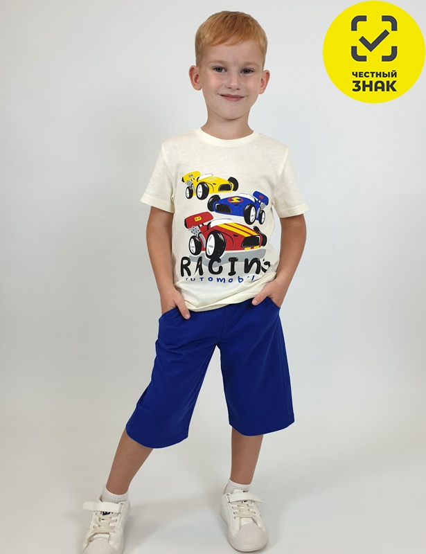Комплект для мальчика из кулирного полотна. Футболка - прямого кроя, короткий втачной рукав, спереди печать. Горловина обработана ластиком. Шорты удлиненные с притачным поясом и резинкой. Два боковых кармана.